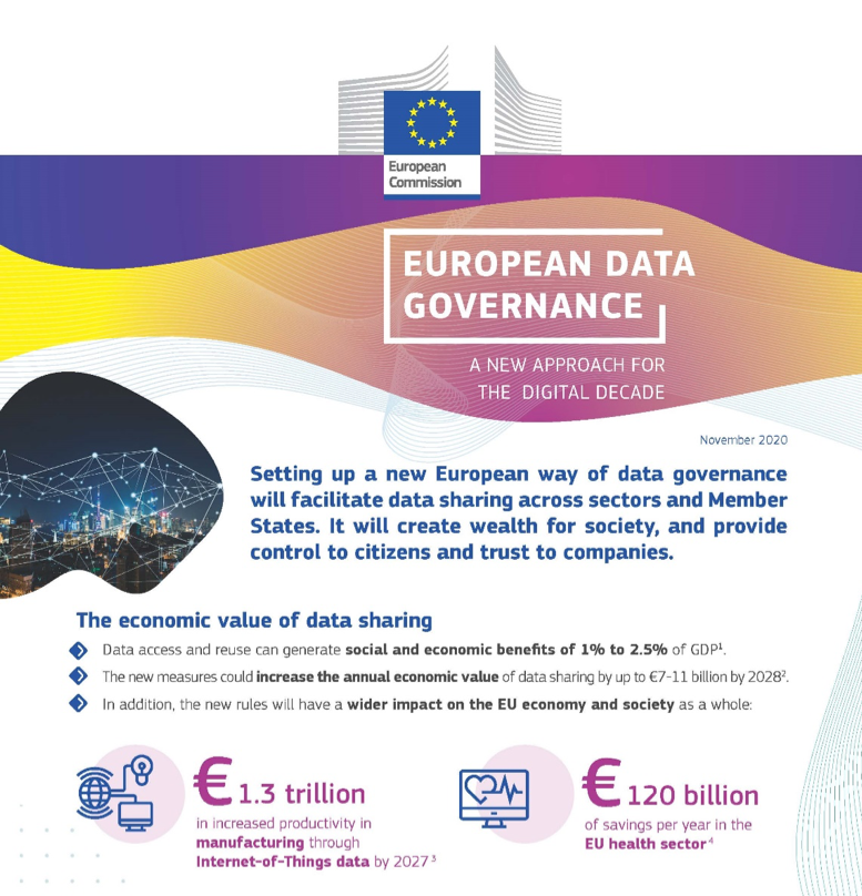 Como parte de la nueva estrategia europea de datos, la comisión ha propuesto el 25 de noviembre una propuesta de Reglamento para la Gobernanza de datos (Data Governance Act) con el objetivo de fomentar el uso de los datos aumentando la confianza en los intermediarios y mejorando los mecanismos de transmisión de datos entre los estados miembros. El nuevo reglamento garantizará que las acciones de los estados miembros en materia de datos estén coordinadas para evitar la fragmentación del mercado único.