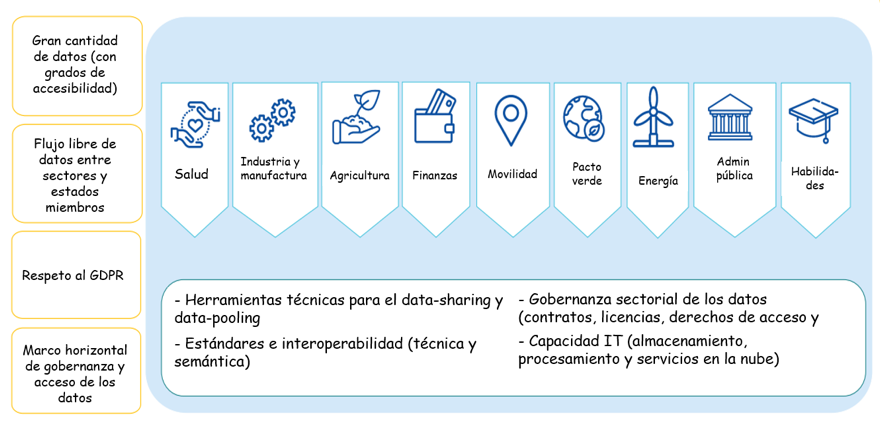 Finalmente, la Comisión está apoyando la creación de espacios comunes europeos de datos, que permitirán el intercambio de datos, tanto en el sector público como privado, de manera fiable y de bajo coste. Estos espacios de datos están compuestos tanto por infraestructura tecnológica como por mecanismos de gobernanza.